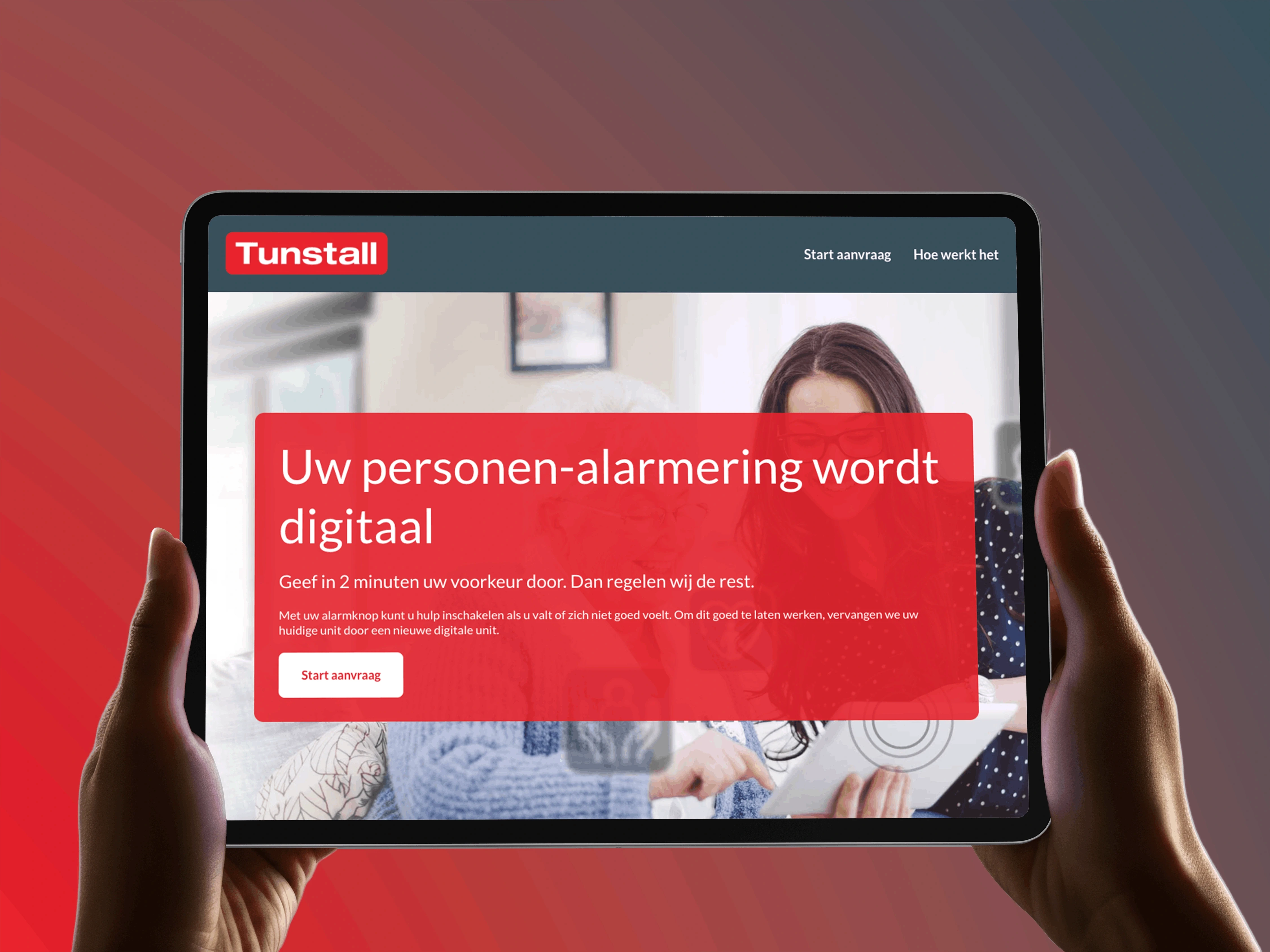 Tunstall levert persoonlijke alarmeringssystemen. Dat zijn de bekende alarmknoppen die ouderen om hun nek dragen om met één druk op de knop hulp in te schakelen. De huidige apparaten waren verouderd en moesten worden vervangen. Ruim 60.000 ouderen kregen een keuze: overstappen naar een digitale unit of een nieuw fysiek apparaat ontvangen. Maar voor een doelgroep met een gemiddelde leeftijd van 78 jaar wordt zo'n keuzeproces al snel overweldigend. Tunstall had een oplossing nodig die dit simpel en stressvrij zou maken.