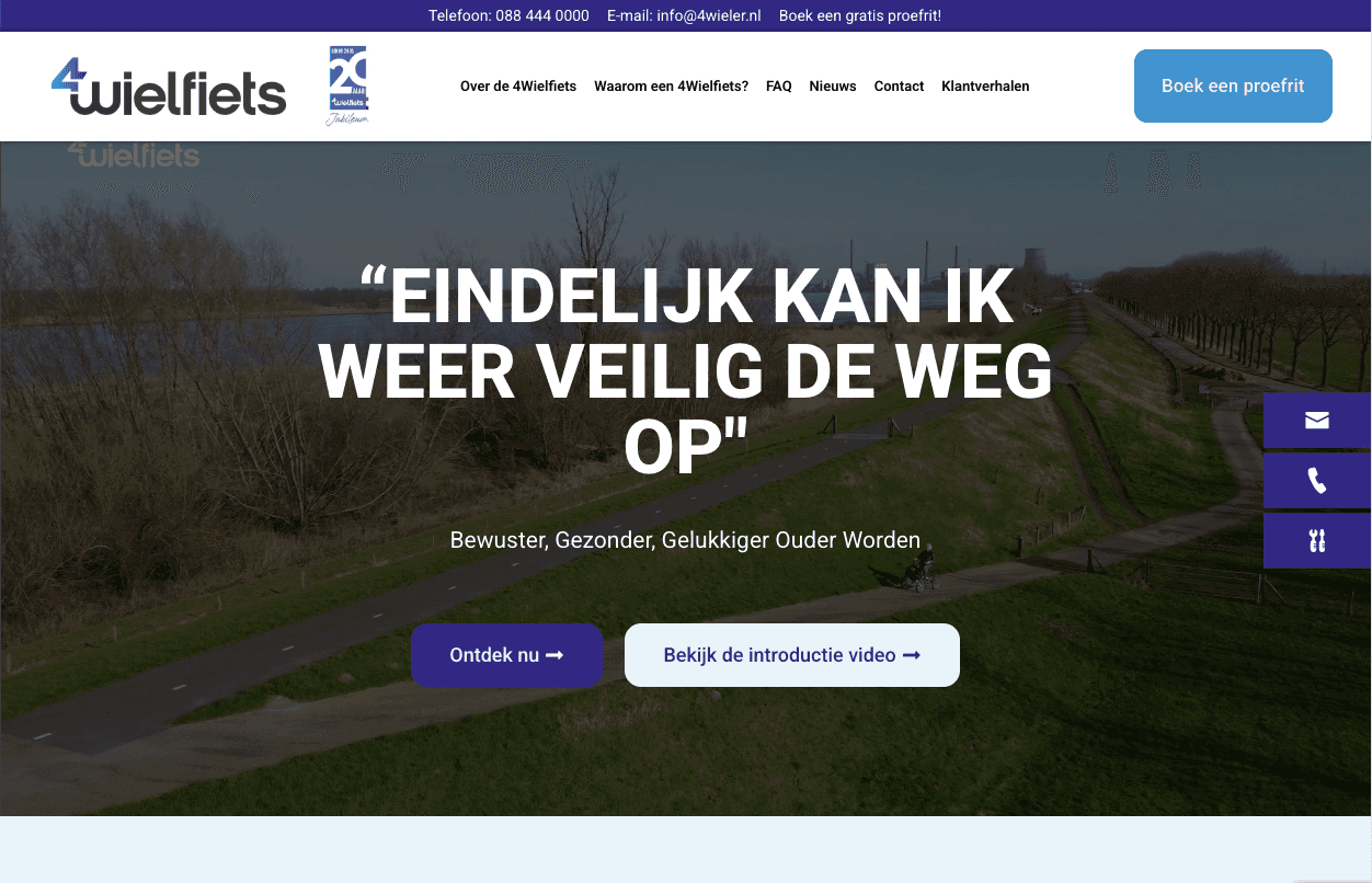 De website vertelt niet alleen wat 4wielfiets doet, maar vooral wat het betekent. We brachten techniek en emotie samen in één ervaring. Bezoekers kunnen eenvoudig modellen vergelijken, proefritten plannen en verhalen lezen van mensen die hun vrijheid hebben teruggevonden.