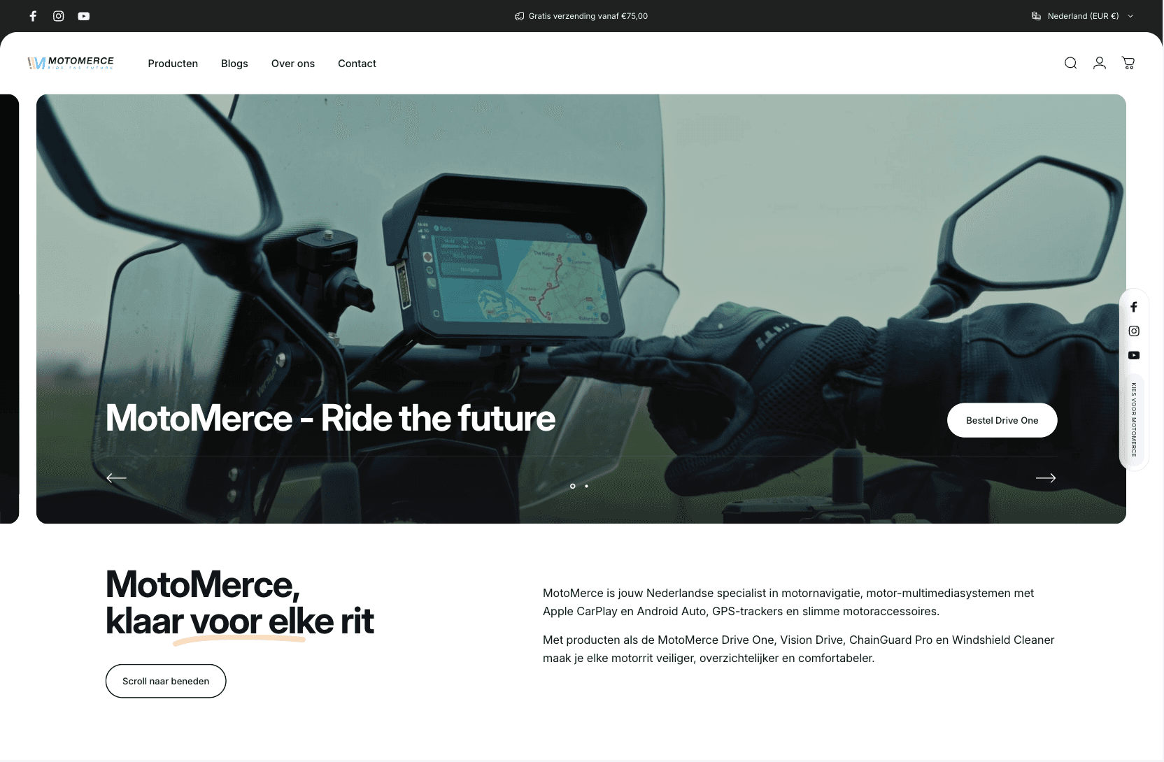 Voor Motomerce hebben we de webshop aangescherpt en visueel opgefrist. Alles sneller, duidelijker en strakker. We schoten een header video voor een sterke binnenkomer en maakten twee social video’s voor advertenties om gericht meer verkeer naar de vernieuwde shop te trekken.