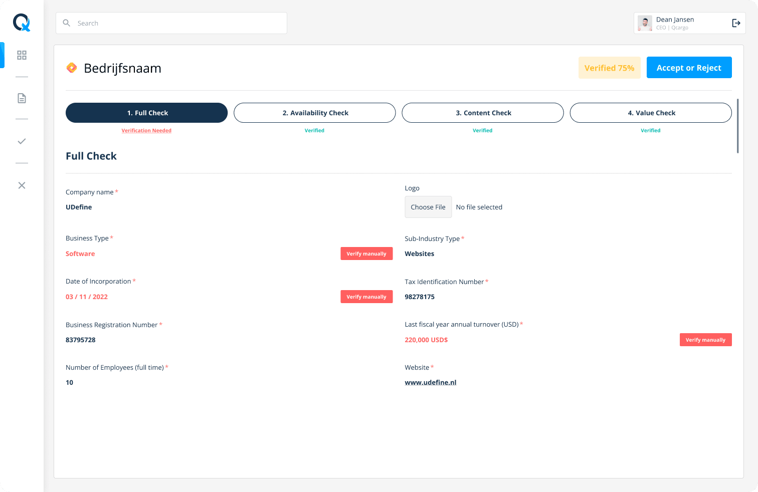 Voor Q-Cargo ontwikkelden we software die het aangaan van nieuwe samenwerkingen eenvoudiger maakt. In de logistiek kost het uitwisselen en controleren van documenten vaak veel tijd. Wij bouwden een platform waarin bedrijven hun documenten op één plek aanleveren, waarna deze snel worden gecontroleerd en goedgekeurd. Na afronding ontvangen bedrijven een Q-Cargo-certificaat en kunnen zij direct samenwerken. Zo wordt een proces dat eerder maanden duurde teruggebracht naar ongeveer een week.