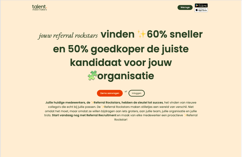 Talent Matchmakers wilde een plek waar referral recruitment eindelijk overzichtelijk werkt. We bouwden een website die duidelijk laat zien hoe het platform vacatures deelt, beloningen registreert en alles automatisch bijhoudt. Snel, helder en gemaakt om meteen te converteren.