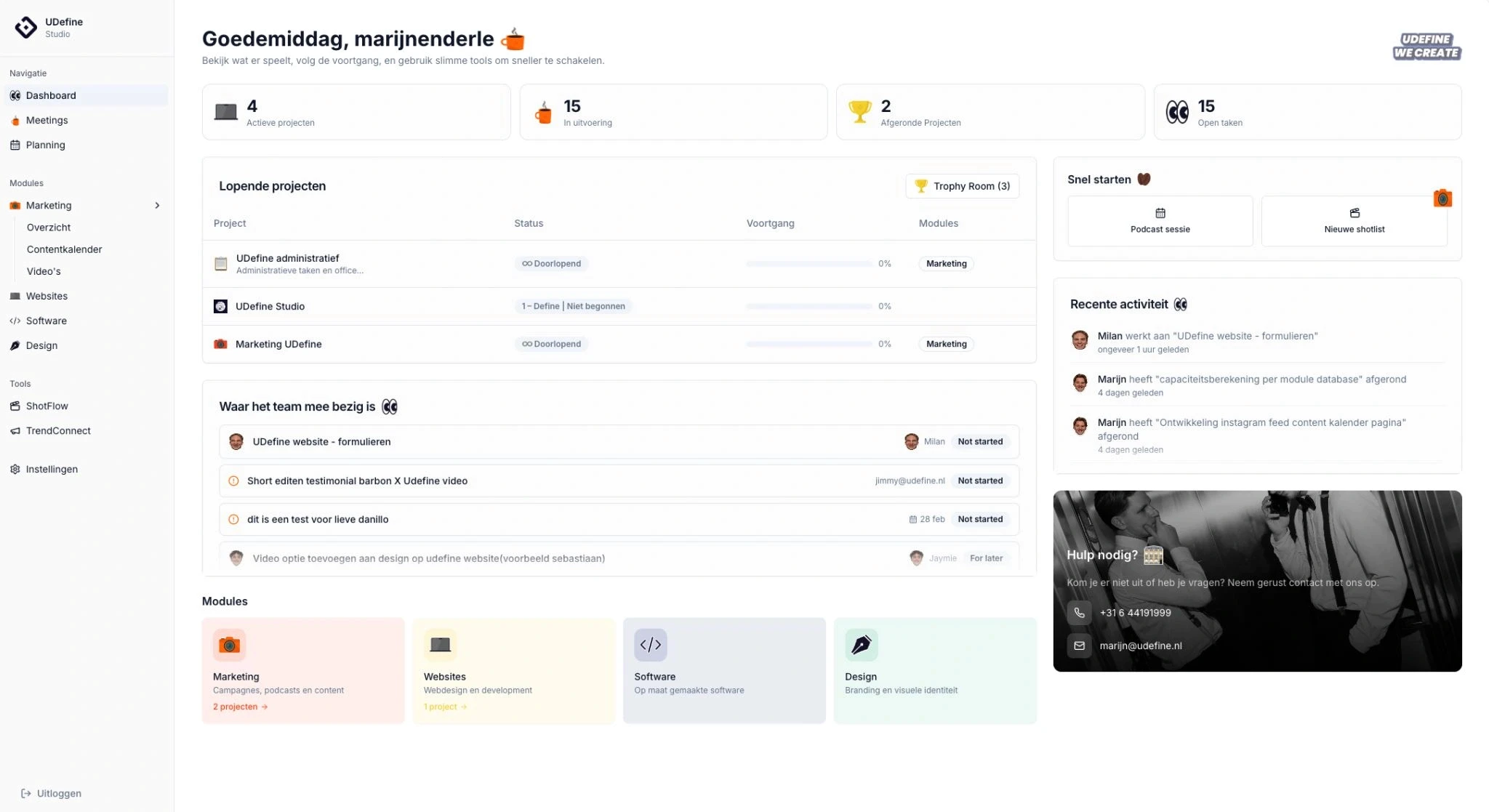 Zo ontstond UDefine Studio: een eigen platform, gebouwd met Lovable, waar klanten alles rondom hun merk op één plek kunnen beheren. Van website en contentkalender tot designaanvragen voor een beurs en het volgen van software-voortgang. Geen losse tools meer, maar één overzichtelijk dashboard.